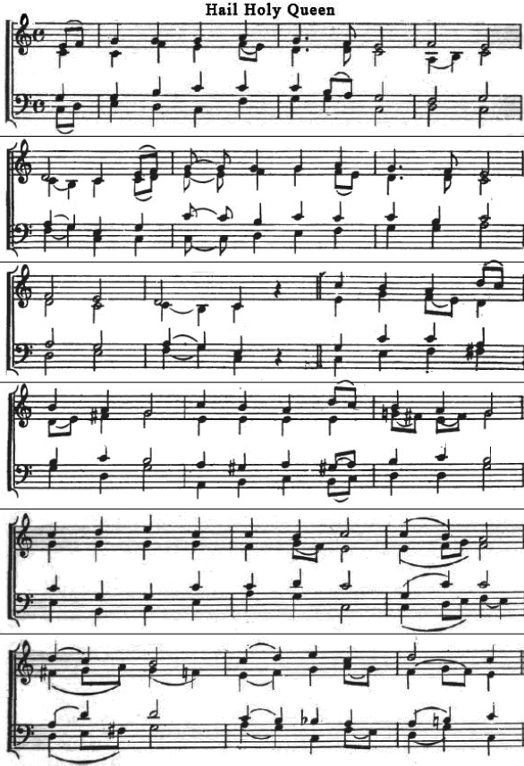 | 1. Hail, holy Queen enthroned above, O Maria! Hail, Mother of Mercy and of Love, O Maria! Refrain |
