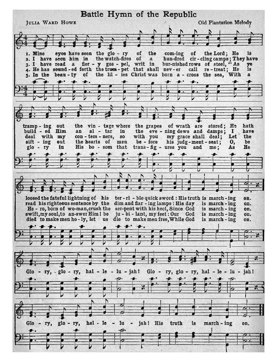 Refrain: Glory! Glory! Hallelujah! Glory! Glory! Hallelujah! Glory! Glory! Hallelujah! His truth is marching on. |