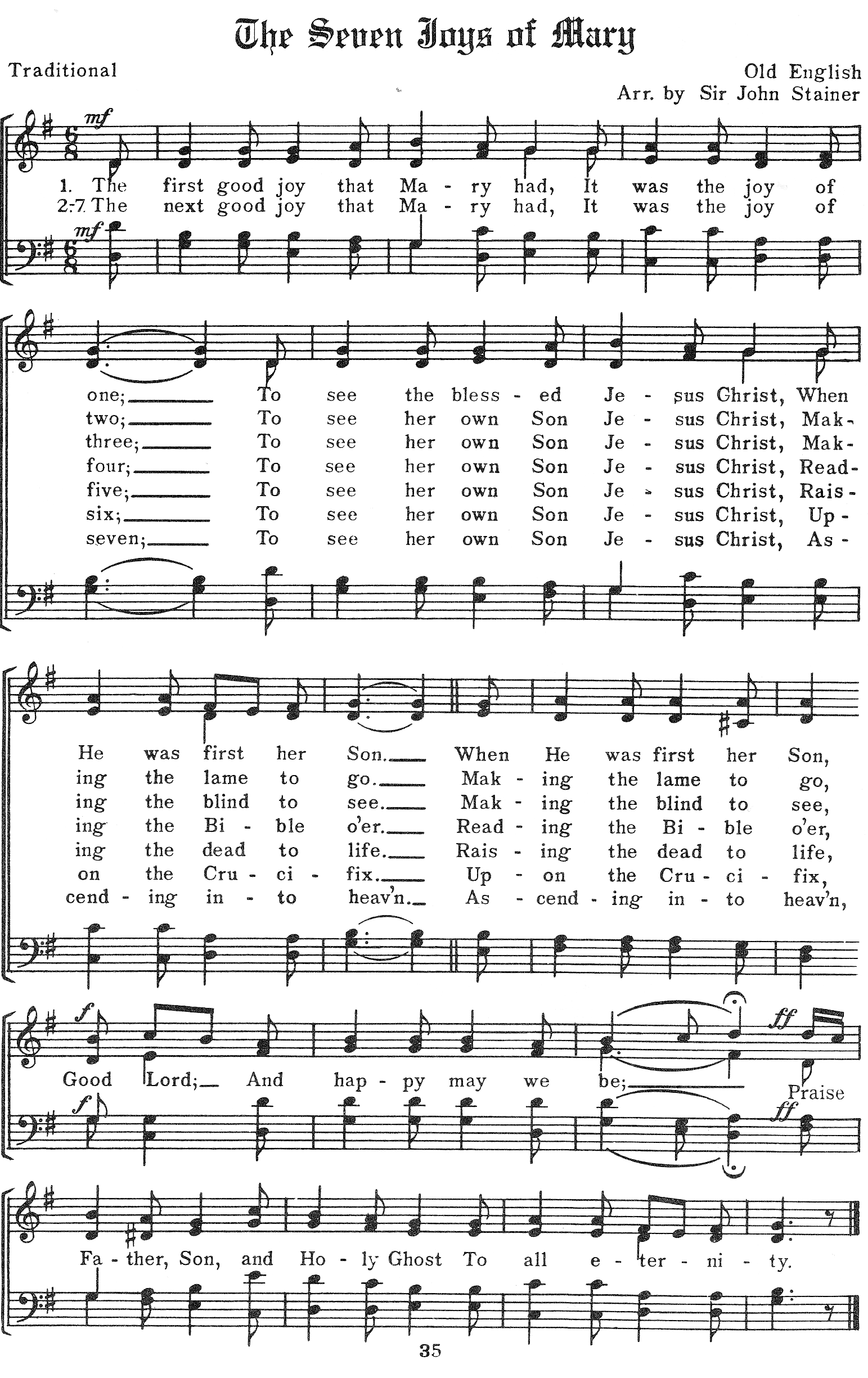 7) The next good joy that Mary had, It was the Joy of seven; To see her own Son Jesus Christ, Ascending into heav’n. Ascending into heav’n, Good Lord; And happy may we be; Praise Father, Son, and Holy Ghost To all eternity. |